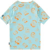 Blå simtröja för aktiva barn med ett orange tecknat mönster i återvunnen polyester med UV50+ skydd. Den har en åtsittande passform med ståkrage och korta raglanärmar. Det stretchiga materialet säkerställer hög komfort och den är perfekt för stranden och poolen.