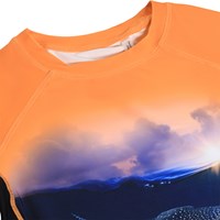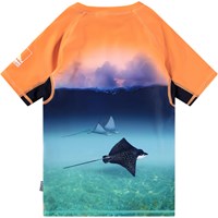 Orange och blå simtröja för aktiva barn med ett havsmönster i återvunnen polyester med UV50+ skydd. Den har en åtsittande passform med ståkrage och korta raglanärmar. Det stretchiga materialet säkerställer hög komfort och den är perfekt för stranden och poolen.