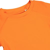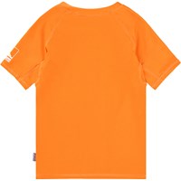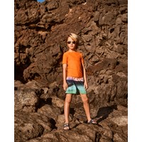 Orange simtröja för aktiva barn i återvunnen polyester med UV50+ skydd. Den har en åtsittande passform med ståkrage och korta raglanärmar. Det stretchiga materialet säkerställer hög komfort och den är perfekt för stranden och poolen.