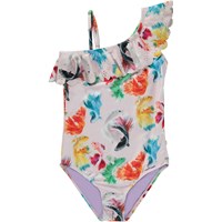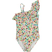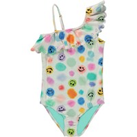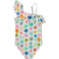 Baddräkt med akvarellmålade prickar i olika färger, där några av dem är glada emojis. Badräkten har ett asymmetriskt och dekorativt axelband med en bred volang och små emoji cot-outs, medan den andra sidan har ett enkelt justerbart axelband, som säkrar att baddräkten sitter där den ska. Den är tillverkad av återvunnen, elastisk polyester, vilket gör den enkel att ta av och på. Den har ett högt UV-skydd på 50+, som effektivt skyddar mot solens strålar. Produkten är CE-märkt och testad enligt standarden EN-13758-1.