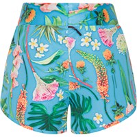 Blå sportiga badshorts med multifärgat mönster i 100% återvunnen polyester. Mönstret består av exotiska blad och blommor. Dessa badshorts är rundskurna, har fickor i sidorna och normal passform. Molos badkläder har UV-sjydd 50+. Produkten är CE-märkt och testad enligt standarden EN-13758-1.