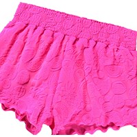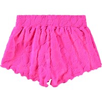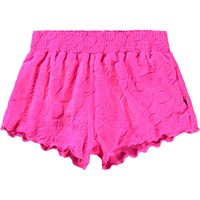 Rosa badshorts för aktiva barn med UV-skydd 50+ och ett mönster av exotiska frukter. Badshortsen har en lös passform, inre shorts och resår i midjan med snörning, vilket gör dem enkla att ta på och av. Produkten är CE-märkt och testad enligt standarden EN-13758-1.