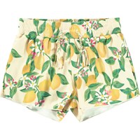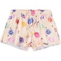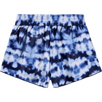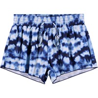 Badshorts med batikmönster i blå nyanser för aktiva barn i återvunnen polyester med UV50+ skydd. De har en lös passform, innershorts och resår samt dragsko i midjan för enkel på- och avtagning.