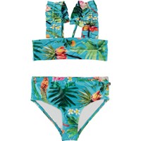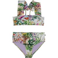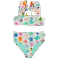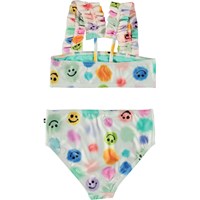 Bikini med mutlifärgade prickar, där några av dem är glada emojis. Bikinin har breda draperade axelband i samma mönster samt en underdel med hög midja. Bikinin är tillverkad i återvunnen polyester med har ett högt UV-skydd på 50+. Produkten är CE-märkt och testad enligt standarden EN-13758-1.