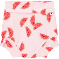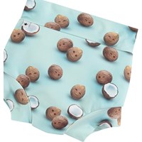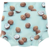 Läckagesäkra badshorts i återvunnen polyester med UV-skydd 50+. Badshortsen är helt fodrade och har en tight passform som omsluter låren och magen nära, vilket gör att de kan bäras utan en simblöja. Badshortsen är ljusblå med färska kokosnötter. Produkten är CE-märkt och testad enligt standarden EN-13758-1.