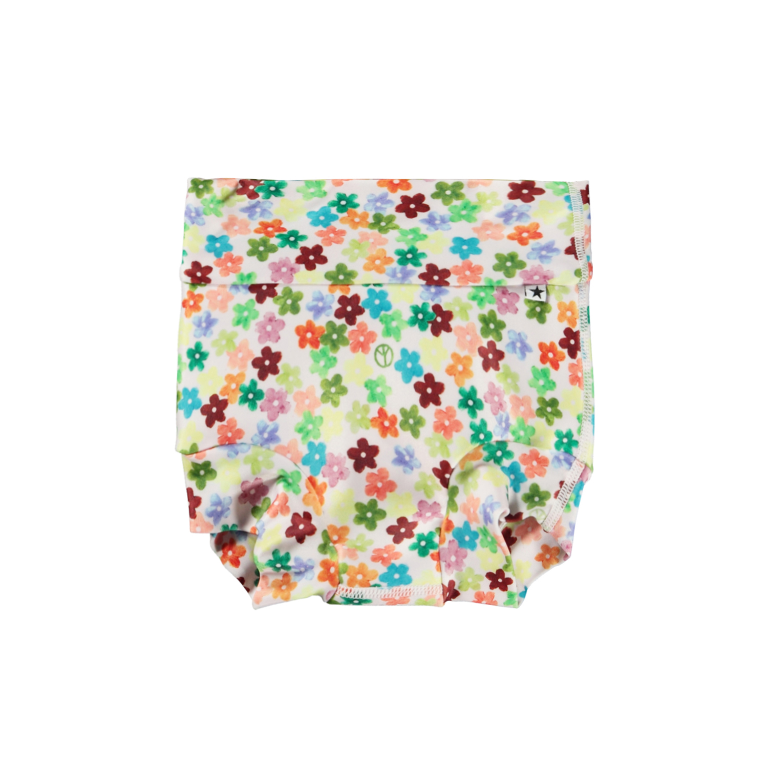 Ljusa läckagefria blöjbadbyxor till baby med ett sött mönster av blommor i olika färger. Tittar man noga efter kan man se ett peacetecken, eller två, bland blommorna. Badbyxorna är fodrade och har en elastisk, tätsittande passform som säkrar att de håller tätt om olyckan skulle vara framme. Detta betyder att de kan användas utan badblöja under. De är tillverkad av återvunnen, elastisk polyester, vilket gör dem enkla att ta av och på. De har ett högt UV-skydd på 50+, som effektivt skyddar mot solens strålar. Produkten är CE-märkt och testad enligt standarden EN-13758-1.