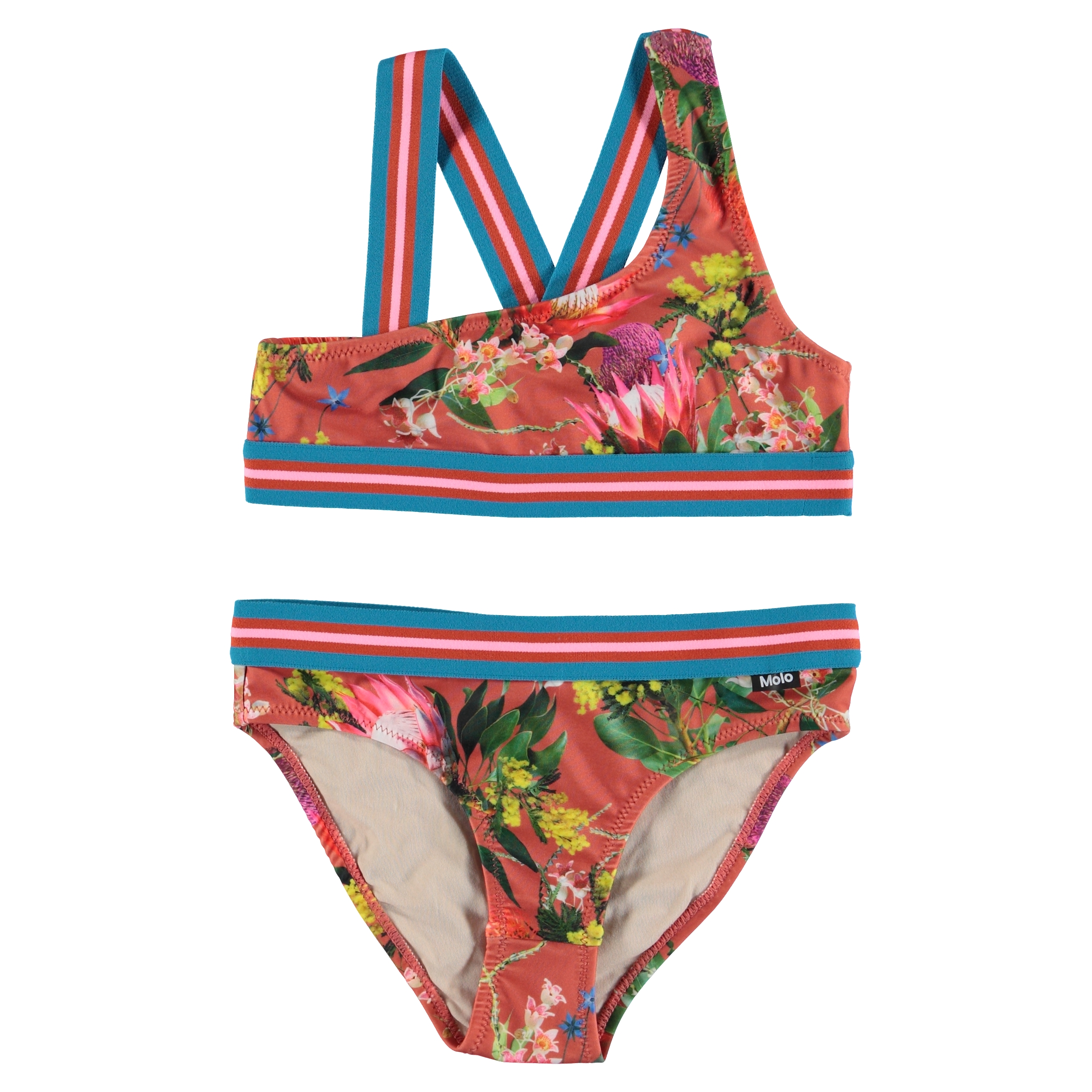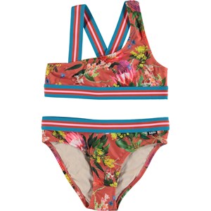 Nicola är en asymmetrisk bikini med trycket 'Australian Flowers'. Bikinin har breda randiga axelband och kantband i blå, rosa och röd. Toppen har korslagda axelband på ryggen. Molo's badkläder har UV skyddsfaktor 50+. Produkten är CE-märkt och testad enligt standarden EN-13758-1.