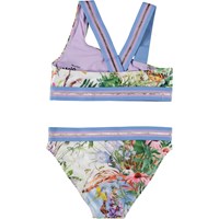 Asymmetrisk sportig bikini med ett fint mönster av en vild blomsteräng. Bikinin har breda axelband i lila och guld, som korsar bak på ryggen. Underdelen har en normal passform med samma breda kant i midjan. Bikinin är tillverkad av återvunnen polyester och har ett högt UV-skydd på 50+.