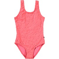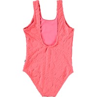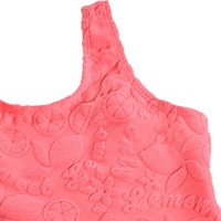 Sportig, rosa baddräkt med citrusmönster för aktiva barn, med UV-skydd 50+. Baddräkten har en normal passform, är helt fodrad, har breda axelband och en djup rygg.