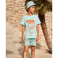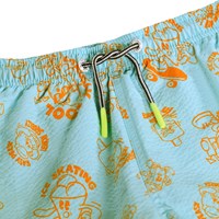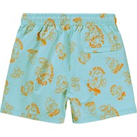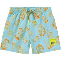 Sportiga, blå badshorts med orange tecknat mönster för aktiva barn och med UV50+ skydd. De har en lös passform, medellång längd, resår och dragsko i midjan, mjuka innermeshshorts och en praktisk bakficka.
