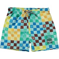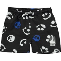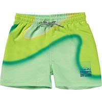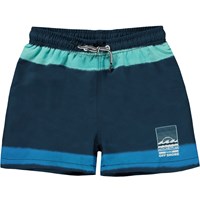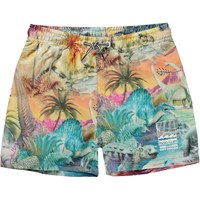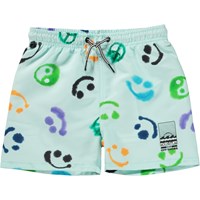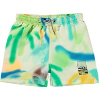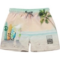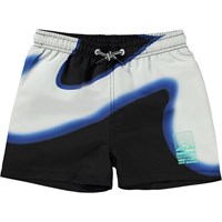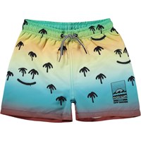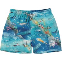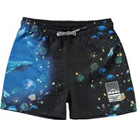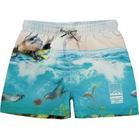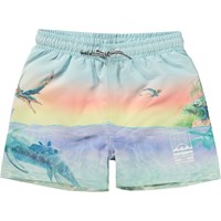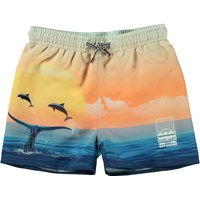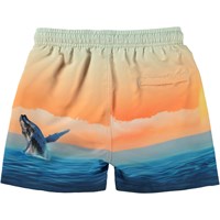 Badshorts med mönsteri blå och orange nyanser, i 100% återvunnen polyester. Mönstret visar en solnedgång över havet, där stjärtfenan på en val och två lekande delfiner skapar en glad emoji. Motivet fortsätter på baksidan där en knölval kastar sig i vågorna. Badshortsen har korta ben, gummiband med knytband i midjan, ett vitt Molo Swim märke framtill, en praktisk bakficka och en vanlig passform. Molos badkläder har UV-skydd 50+. Produkten är CE-märkt och testad enligt standarden EN-13758-1.