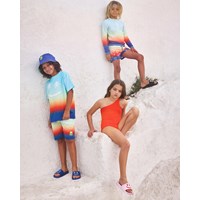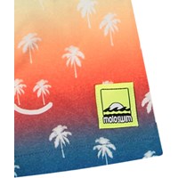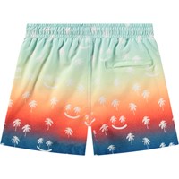 Sportiga badshorts för aktiva barn i återvunnen polyester med UV-skydd 50+. Badshortsen har en lös passform, når till mitten av låret, har en enkel bakficka, resår i midjan med dragsko och mjuka meshinnerbyxor. Badshortsen är regnbågsfärgade med leende palmer. Produkten är CE-märkt och testad enligt standarden EN-13758-1.