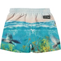 Badshorts i ljusa nyanser med med mönster som föreställer lekande sjölejon i vågorna. Badshortsen är i 100% återvunnen polyetser, har korta ben, gummiband med knytband i midjan, ett vitt Molo Swim märke framtill, en praktisk bakficka och en vanlig passform. Molos badkläder har UV-skydd 50+. Produkten är CE-märkt och testad enligt standarden EN-13758-1.