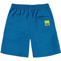 Blå badshorts med långa ben, tillverkade av delvist återvunnen nylon. Badshortsen har gummiband med knytband i midjan, fickor i sidorna, en bakficka med neongult Molo Swim märke och en lös passform. Molos badkläder har UV-skydd 50+. Produkten är CE-märkt och testad enligt standarden EN-13758-1.