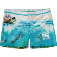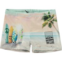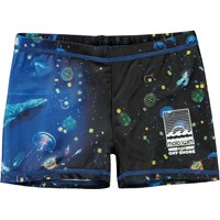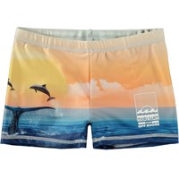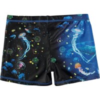 Svarta tighta badbyxor med ett Molo Swim märke på ena benet. Möntsret visar ett mörkt hav med lysande plankton och maneter och en sto knölval i ett ljusken. Badbyxorna har ett invändigt knytband och det stretchiga materialet ger bra rörelseförmåga. De är tillverkade av återvunnen polyester och har ett högt UV-skydd på 50+, som skyddar effektivt mot solens strålar. Produkten är CE-märkt och testad enligt standarden EN-13758-1.