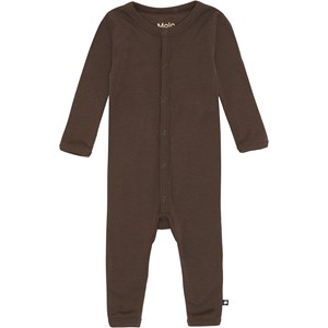 Fahari är en brun babydräkt i 100% Merino ull med blommor. Dräkten har långa ärmar och ben, samt V-ringning och knappar framtill.