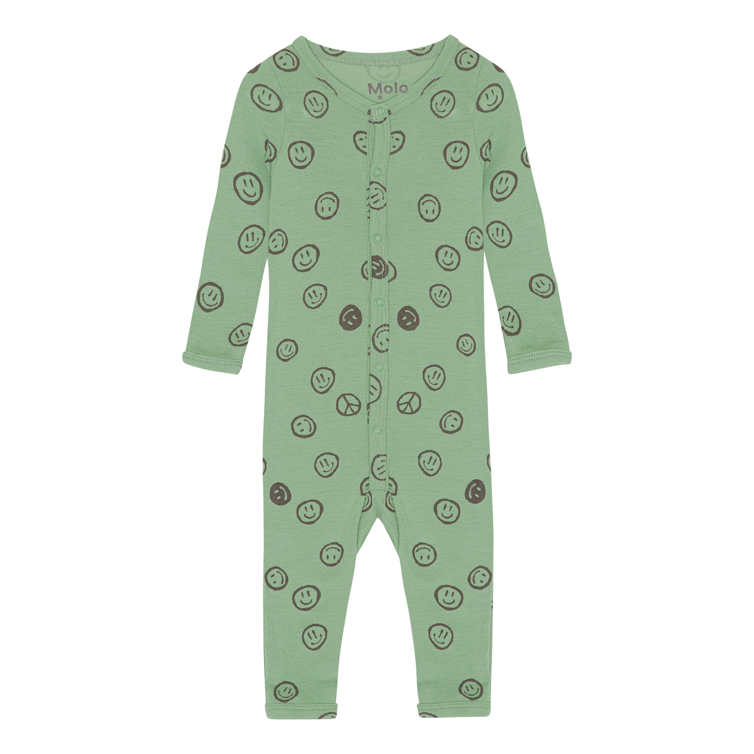 Grön babydräkt med massor av små smileys och peacetecken. Denna dräkt är tillverkad i 100% merinoull, har långa ärmar, långa ben och tryckknappar ner framtill.