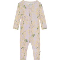 Ljuslila babydräktmed de finaste mimosa blomsterrankor i gult. Denna dräkt är tillverkad i 100% merinoull, har långa ärmar, långa ben och tryckknappar ner framtill.