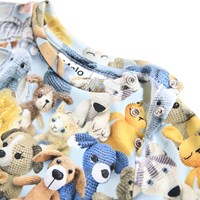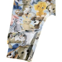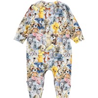 Heldräkt i mjuk ekologisk bomull med virkade djur. Dräkten har långa ärmar och ben samt tryckknappar på ena axeln och mellan benen för att underlätta på- och avtagning. Den är lös och har ribbade kanter på ärmarna och benen för att vara bekväm att bära och ge gott om utrymme att röra sig.