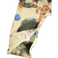 Brun heldräkt i mjuk ekologisk bomull med taxar. Dräkten har långa ärmar och ben samt tryckknappar på ena axeln och mellan benen för att göra den enkel att ta av och på. Den är lös och har ribbade kanter på ärmarna och benen för att göra den bekväm att bära och ge gott om utrymme att röra sig.