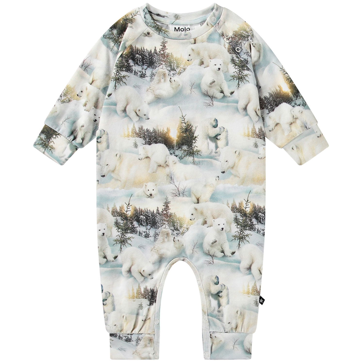 Lätt jumpsuit i ekologisk bomull med långa ärmar och ben med tryckknappar på ena axeln och mellan benen som gör den enkelt att ta på och av. Den har en tight passform med ribbstickade muddar vid ärmar och ben och mönster med isbjörnar som leker i snön.