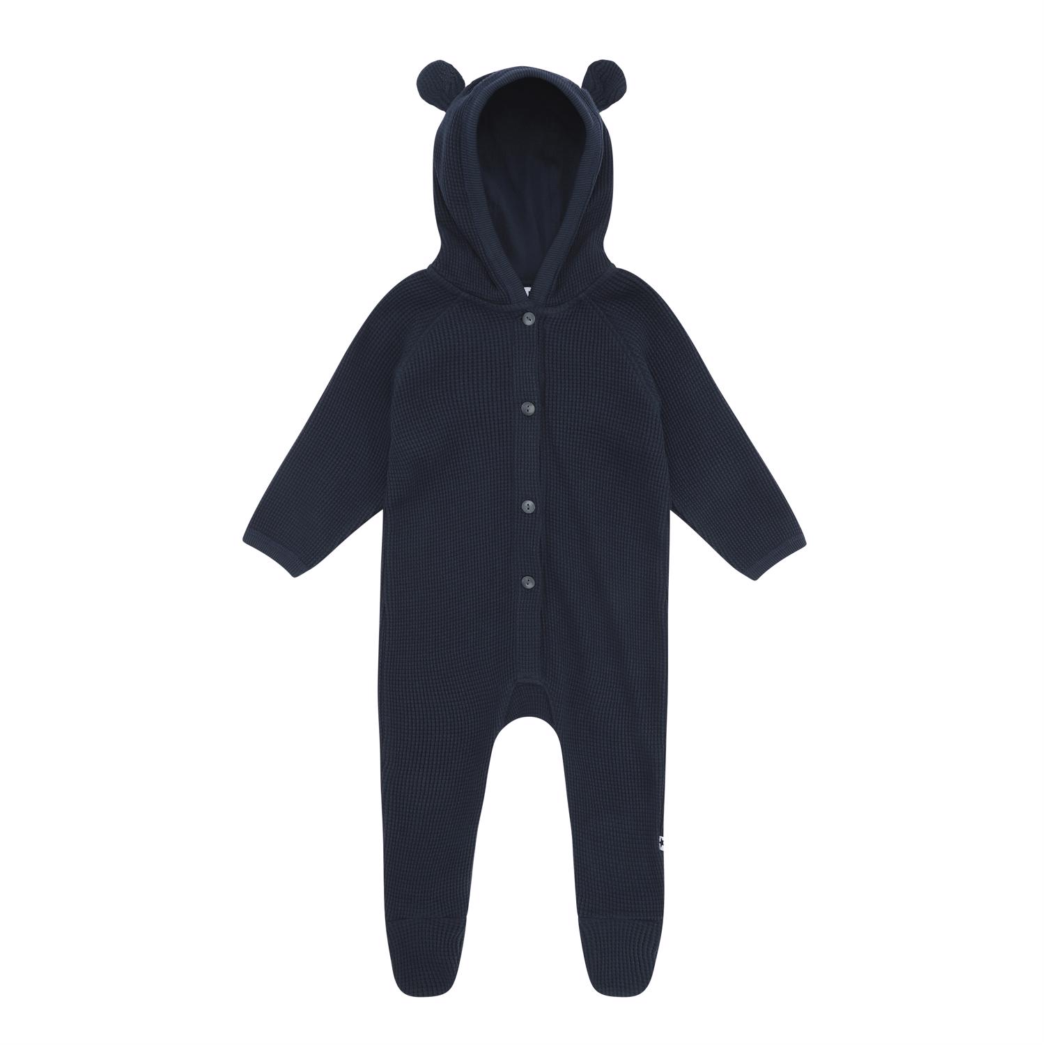 Faith är en mörkblå body med knappar framtill och en luva med påsydda öron. Notera att storlek 56-74 har fötter, medan storlek 80-92 är utan fötter.