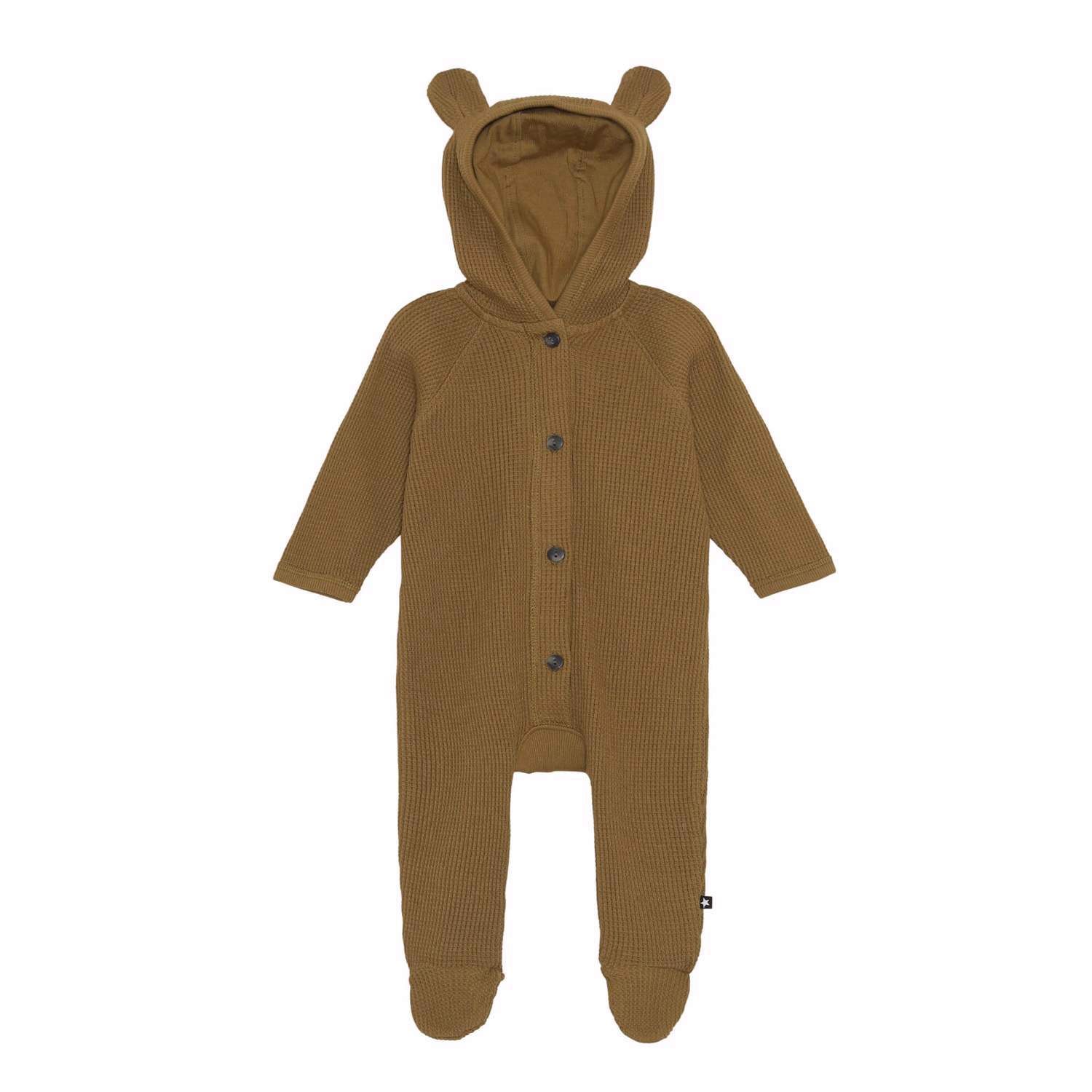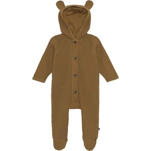 Faith är en grönbrun våffelvävd babydräkt med kknappar framtill och luva med små påsydda öron. Notera att dräkten har fötter i storlek 56-74 och är utan fötter i storlekarna 80-92.