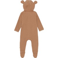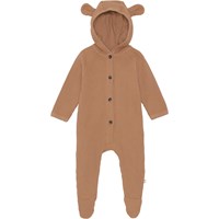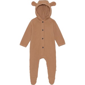 Faith är en rosa våffelvävd babydräkt med knappar framtill och luva med påsydda öron. Notera att dräkten har fötter i str. 56-74 medan dräkten är utan från str. 80-92.