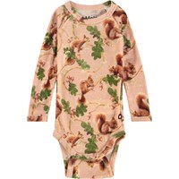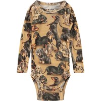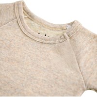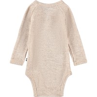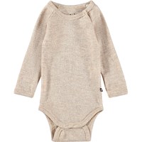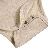 Beige långärmad body i merinoull med tryckknappar vid kragen och mellan benen för att göra den enkel att ta på och av.