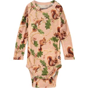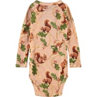 Rosarandig långärmad body i merinoull med ekorrar och löv. Denna body har en tryckknapp vid kragen och mellan benen för att göra den enkel att ta på och av.