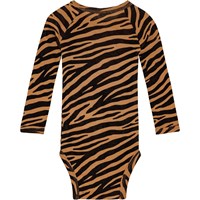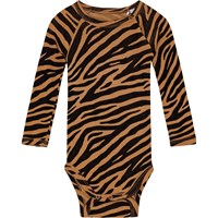 Svart och orange långärmad body med zebraränder tillverkad av ekologisk merinoull. Den har tryckknappar vid kragen och mellan benen, vilket gör den enkel att ta på och av.