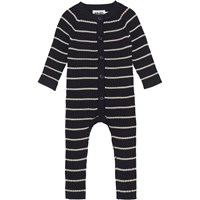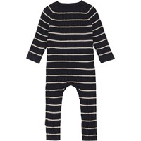 Farley är en stickad blå babydräkt med vita ränder. Dräkten är i 80% bomull och 20% ull och har långa ärmar och ben, samt knappar framtill.