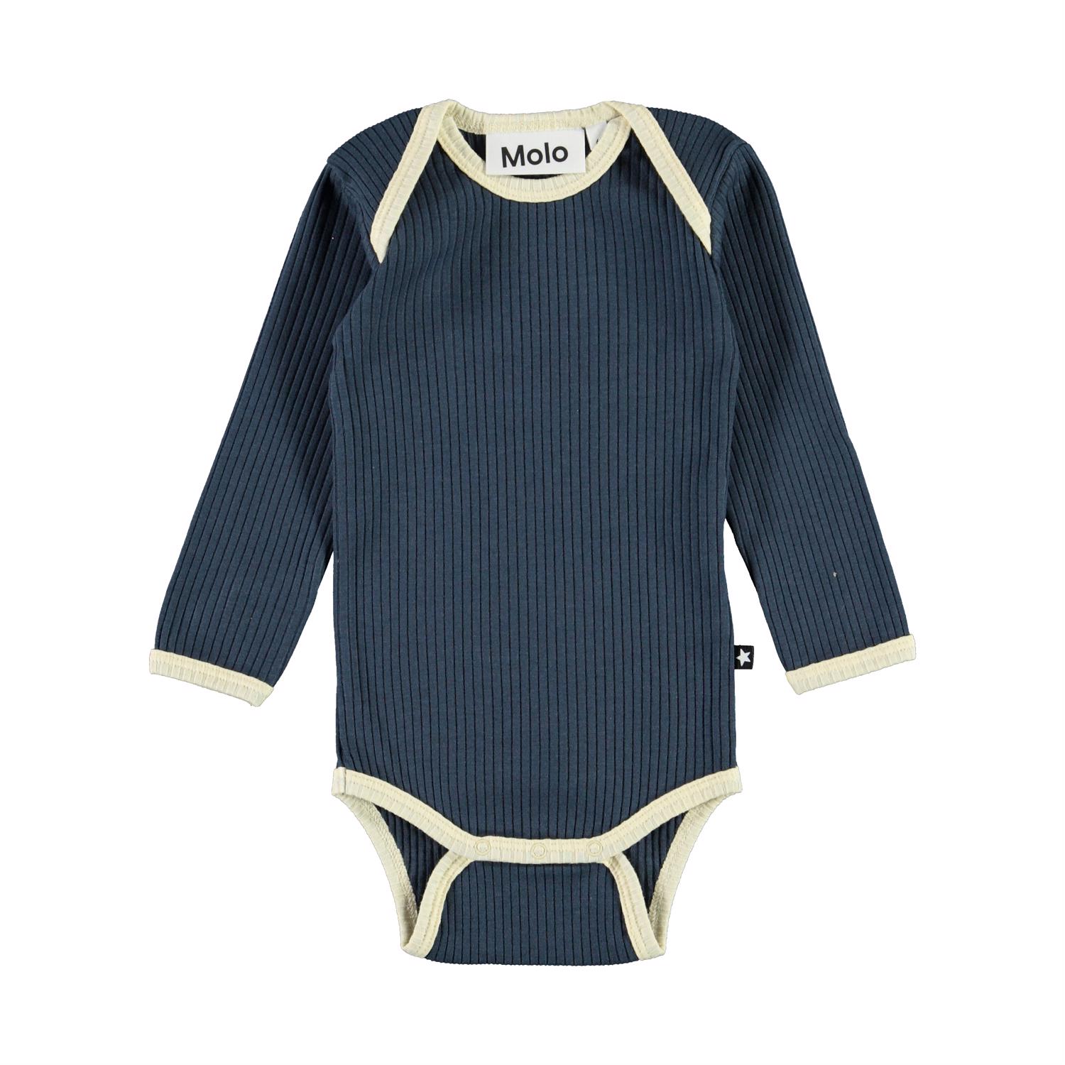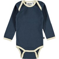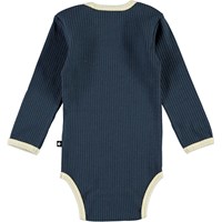 Faros är en mörkblå långärmad body med smala ljusblå ränder. Tryckknappar mellan benen gör det enkelt att ta på och av bodyn. Baby essentials.