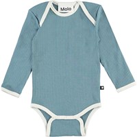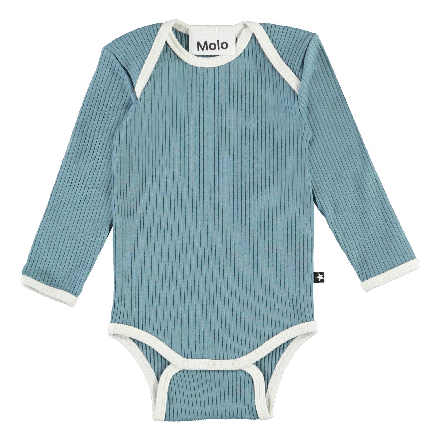 Faros är en ljusblå ribbad body. Faros har en tryckknapp i kragen och mellan benen, vilket gör den enkel att ta på och av. Denna artikel är gjord av ekologisk bomull.