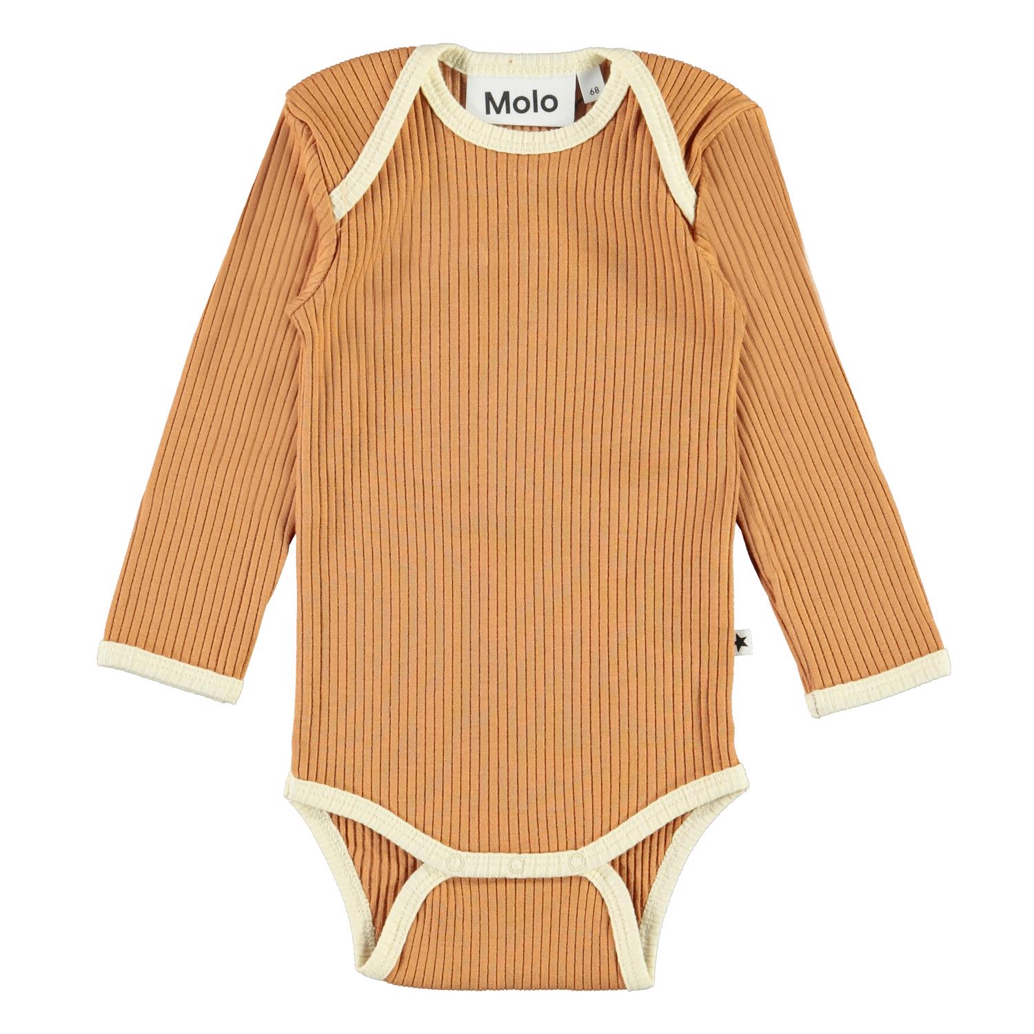 Faros är en brun ribbad body med ljusgul kant. Faros har en tryckknapp i kragen och mellan benen, vilket gör den enkel att ta på och av.