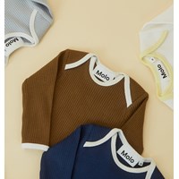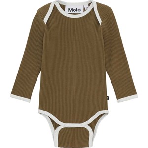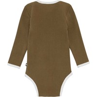 Faros är en grönbrun långärmad babybody i ribbad kvalitet med vitt kantband. Faros har tryckknapp i kragen och mellan benen som gör den enkel att ta av och på. Kombinera med matchande byxor.