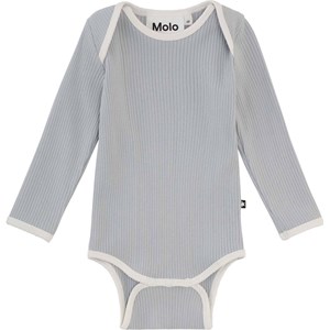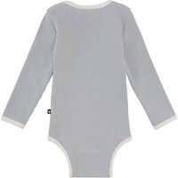 Faros är en ljus gråblå långärmad babybody i ribbad kvalitet med vitt kantband. Faros har tryckknapp i kragen och mellan benen som gör den enkel att ta av och på. Kombinera med matchande byxor.