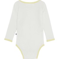 Faros är en vit långärmad babybody i ribbad kvalitet med citrongult kantband. Faros har tryckknapp i kragen och mellan benen som gör den enkel att ta av och på. Kombinera med matchande byxor.
