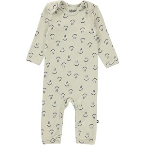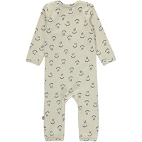 Faso är en beige babydräkt med små smileys. Dräkten har långa ärmar och ben, samt tryckknappar vid hals och ben vilket gör den enkel att ta av och på.