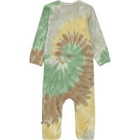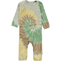 Faso är en babydräkt med tie-dye spiral i grön, gul, brun och grå. Dräkten har långa ärmar och ben, samt tryckknappar mellan benen som gör den enkel att ta av och på. Allt Molo´s tie-dye är handgjort vilket gör att det kan variera från plagg till plagg.