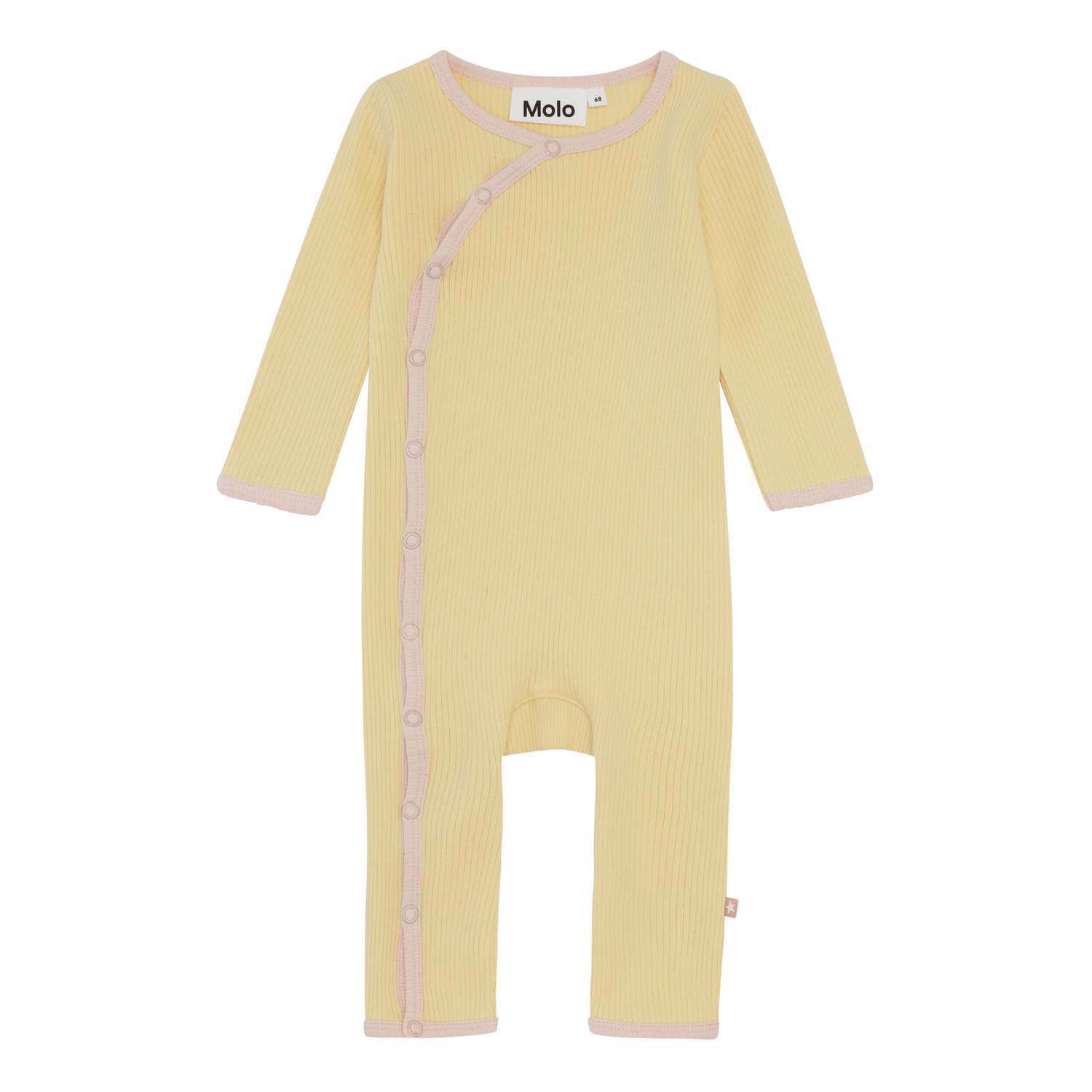 Fellow är en ljusgul babydräkt i ribb med långa ärmar och ben, och rosa kantband. Dräkten har en fin V-hals som fortsätter ut med tryckknappar längs hea ena sidan av dräkten.