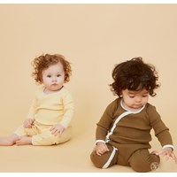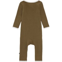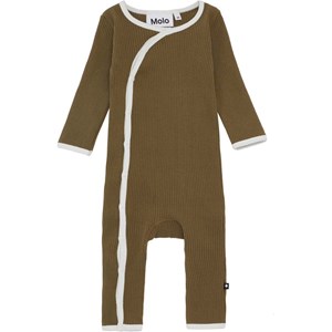 Fellow är en grönbrun babydräkt i ribb med långa ärmar och ben, och vitt kantband. Dräkten har en fin V-hals som fortsätter ut med tryckknappar längs hea ena sidan av dräkten.