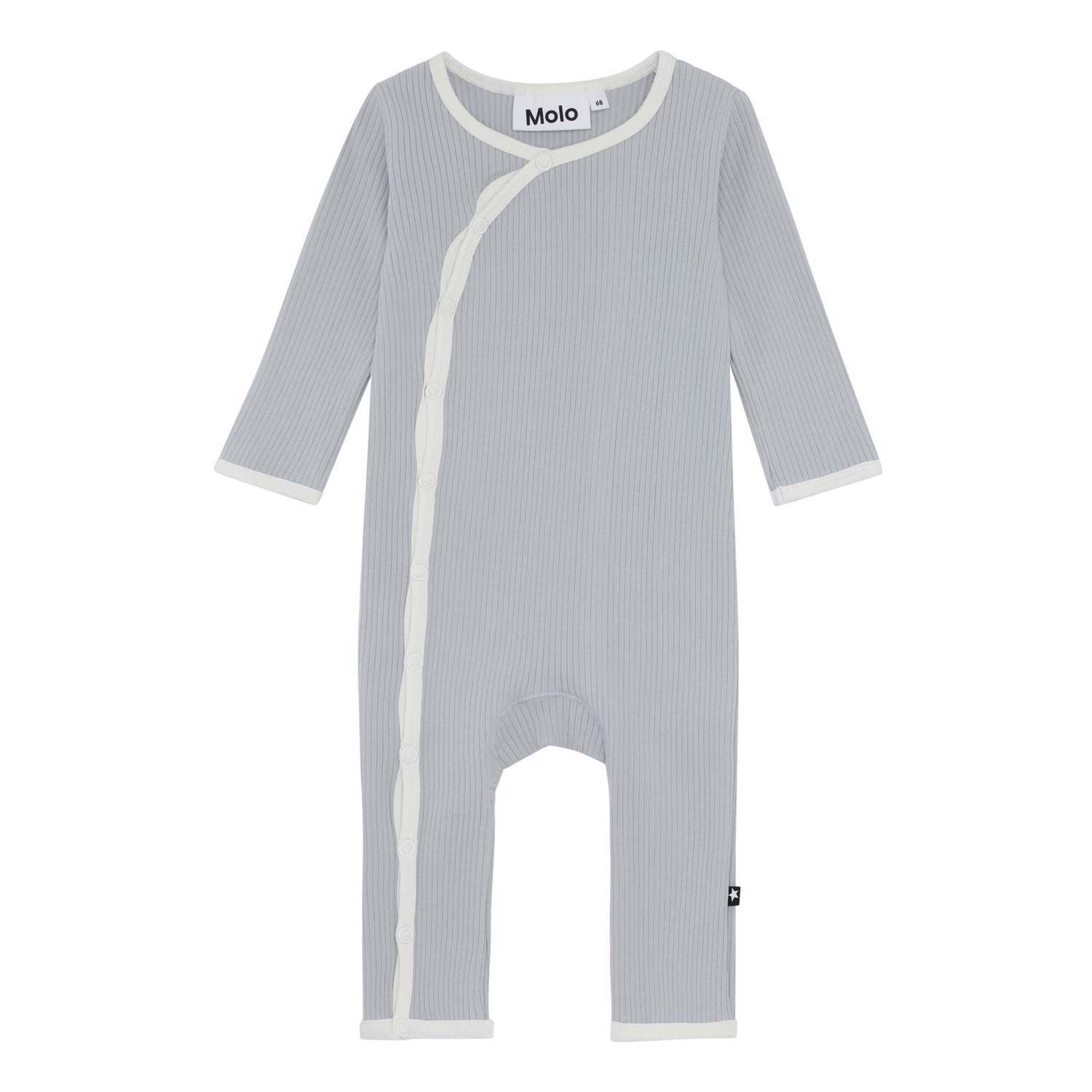 Fellow är en ljus blågrå babydräkt i ribb med långa ärmar och ben, och vitt kantband. Dräkten har en fin V-hals som fortsätter ut med tryckknappar längs hea ena sidan av dräkten.