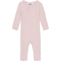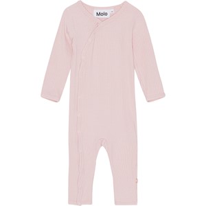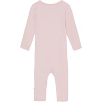 Rosa babydräkt i ribbad jersey. Denna dräkt är tillverkad i ribbad viskojersey, har långa ärmar, långa ben och tryckknappar ner framtill, vilket gör den enkel att ta av och på.