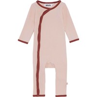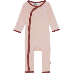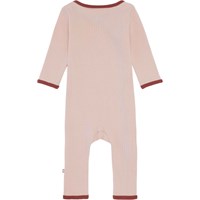 Fellow är en ljusrosa babydräkt i ribb med långa ärmar och ben, och röda kantband. Dräkten har en fin V-hals som fortsätter ut med tryckknappar längs hea ena sidan av dräkten.