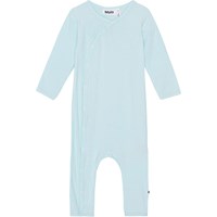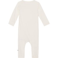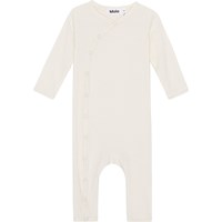 Råvit babydräkt i en mjuk ribbad viskos. Dräkten har tryckknappar längs den ena sidan, vilket gör den enkel att ta av och på. Dräkten är tight, har v hals och långa ärmar och ben.