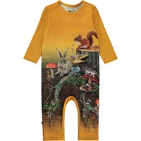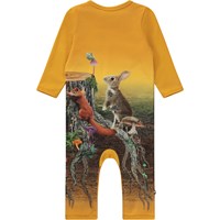 Orange babybdräkt med små gulliga gnagare. Vi följer tröstubbens rötter under jorden där det både växer svampar och bor små möss. Historien fortsätter bak på dräkten. Denna babydräkt är tillverkad i 100% bomull, har långa ärmar, långa ben och tryckknappar vid både hals och mellan benen, vilket gör den enkel att ta av och på.