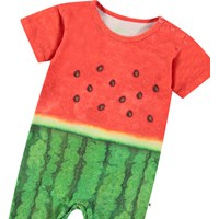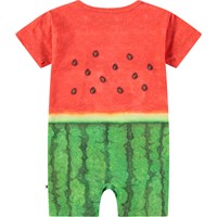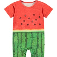 Jumpsuit i ekologisk bomullsjersey för de små. Jumpsuiten har korta ärmar och ben, samt knappar på axeln och mellan benen, vilket gör det enkelt att ta på och av. Jumpsuiten har en rymlig passform med gott om utrymme för rörelse och den har ett vattenmelonsmönster i röda och gröna nyanser.