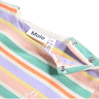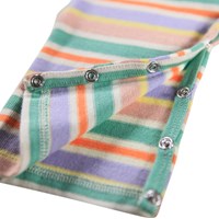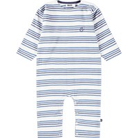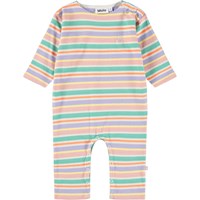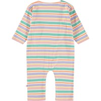 Flerfärgad heldräkt i ekologisk bomull med ränder och en vit smiley broderad på bröstet. Dräkten har långa ärmar och ben samt tryckknappar på axeln och mellan benen för att göra den enkel att ta på och av.