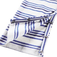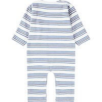 Heldräkt i ekologisk bomull för baby med blåa ränder och en blå smiley broderad på bröstet. Dräkten har långa ärmar och ben samt tryckknappar på axlarna och mellan benen för att göra den enkel att ta på och av.